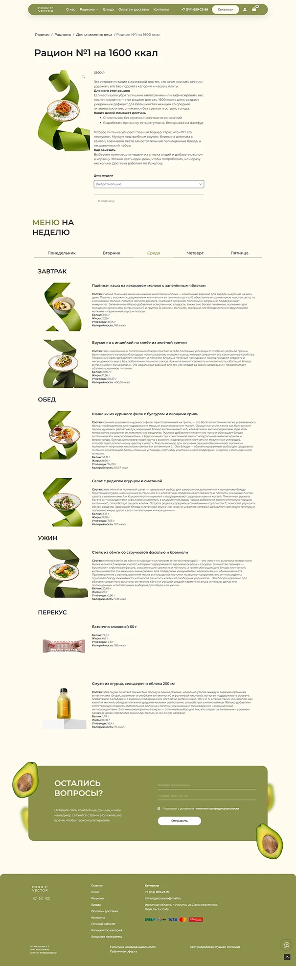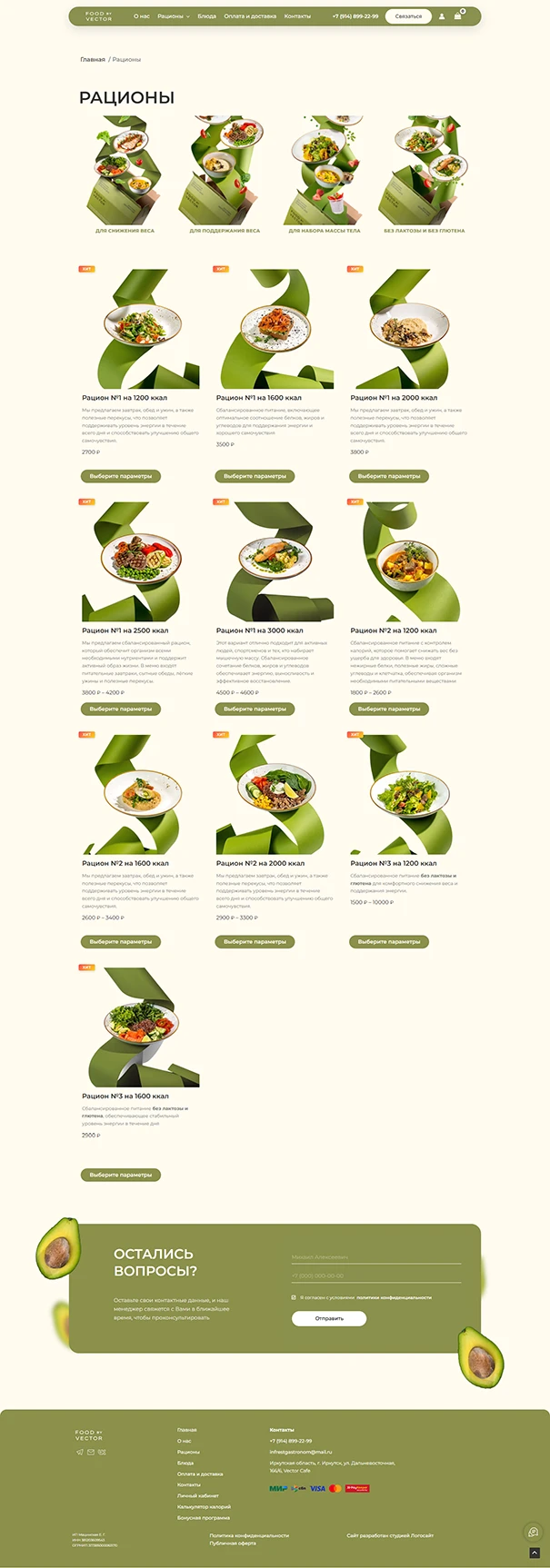 На главной странице мы вывели чёткий оффер и быстрый выбор направлений: снижение/поддержание/набор веса, а также рационы без лактозы и глютена. Для тех, кто хочет больше гибкости, реализован сценарий «Собери свой рацион» с переходом к каталогу блюд.