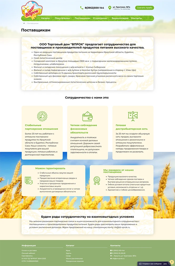 - Структурировать и вывести на сайт широкий ассортимент продукции (много категорий: мука, крупы, масло, макаронные изделия, корм и др.).
