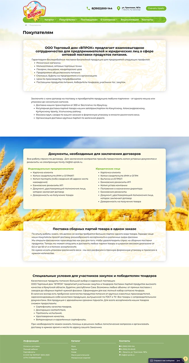 - Структурировать и вывести на сайт широкий ассортимент продукции (много категорий: мука, крупы, масло, макаронные изделия, корм и др.).